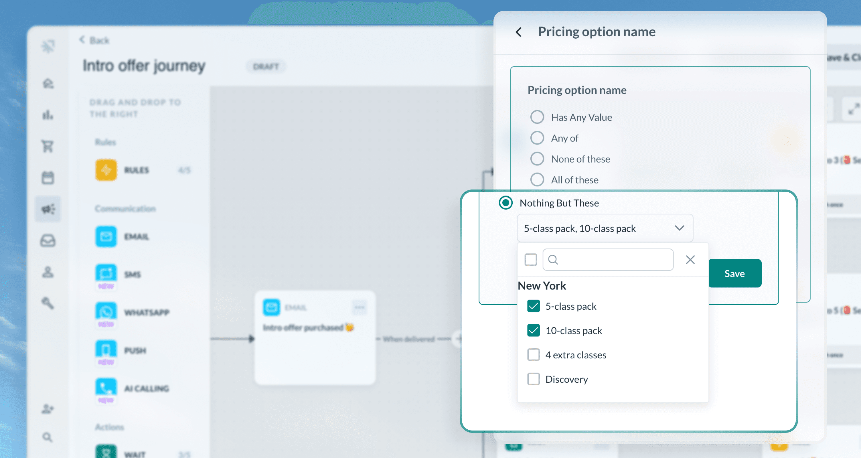 Example: Select 3 pricing options → only contacts with just those 3 (and nothing else) are included.